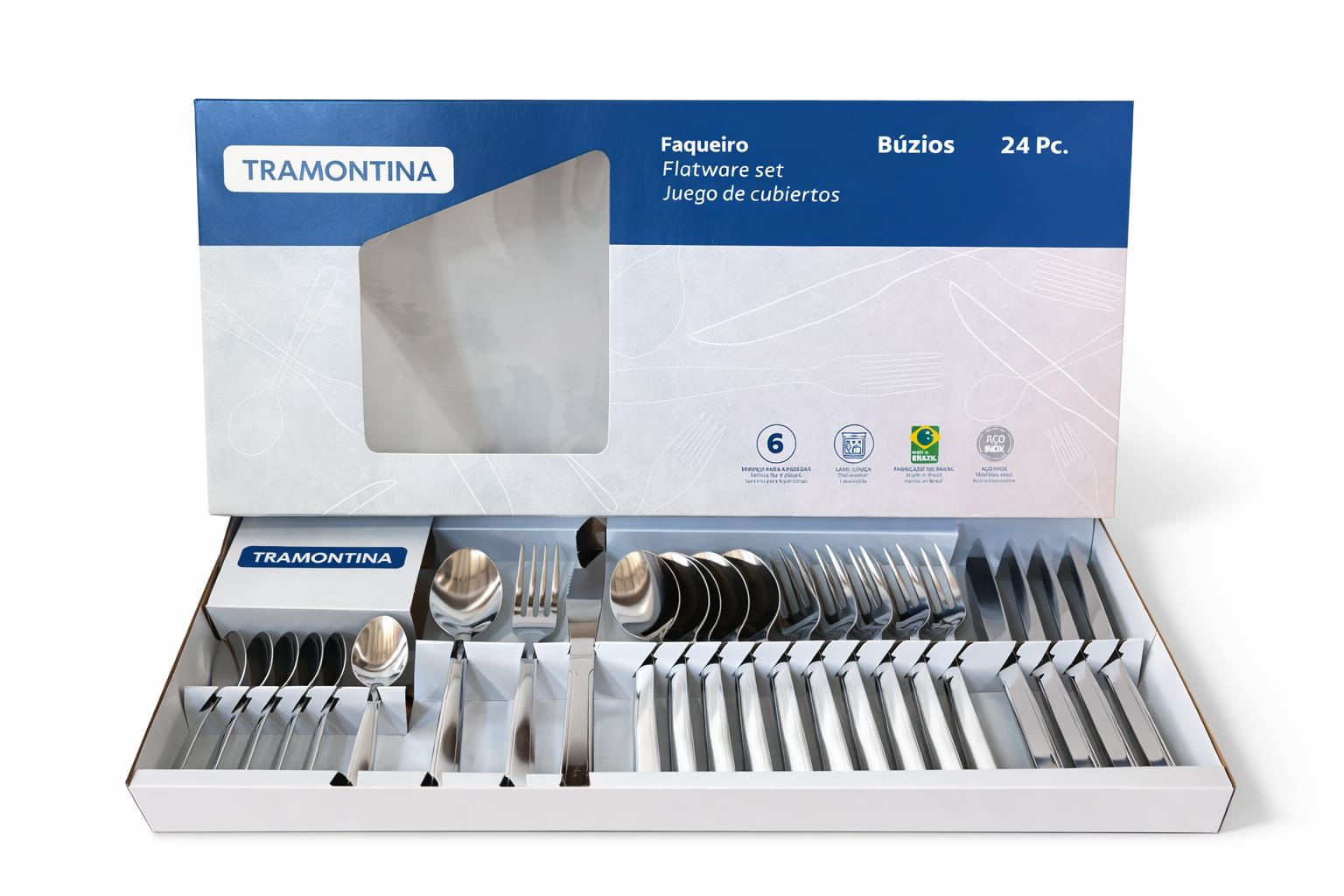 Faqueiro Tramontina Búzios em Aço Inox com Detalhe 24 Peças Produzido totalmente em Aço Inox, o faqueiro Tramontina Búzios possui 24 peças, resistente e durável, ideal para compor a mesa com elegância. As peças têm acabamento de qualidade, proporcionando charme às refeições. São fáceis de limpar e podem ser lavadas na máquina de lavar louças. ESPECIFICAÇÕES: * Marca: Tramontina * Material: Aço Inox * Espessura: 2mm ITENS INCLUSOS / DIMENSÕES: *6 Colher de Mesa Búzios *6 Colher para Chá Búzios *6 Facas Búzios *6 Garfo de Mesa Búzios Medidas da Embalagem: C: 45,20 cm L: 20,7 cm A: 03,80 cm Peso: 770gramas * Certificação NSF – Os produtos da Linha Búzios são certificados pela National Sanitation Foundation (NSF), reconhecida por segurança alimentar e práticas de higiene. RECOMENDAÇÕES DE USO: *Antes da primeira utilização, lave bem as peças e seque-as. *Produto cortante e perfurante: tenha cuidado ao manusear e mantenha fora do alcance de crianças. *Para maior durabilidade dos produtos, recomenda-se lavar manualmente e secá-los antes de guardar. *Para descarte dos produtos e embalagens, siga as orientações de reciclagem vigentes.